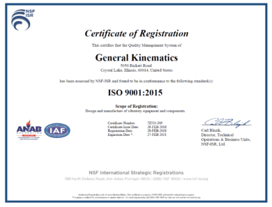 檢查工藝和檢查產(chǎn)品同樣重要。General Kinematics 維持 ISO 9001 注冊(cè),以此持續(xù)體現(xiàn)我們對(duì)質(zhì)量的承諾,并且我們?cè)?2018 年完成了最新 ISO 9001:2015 標(biāo)準(zhǔn)的認(rèn)證。ISO 9001 是國(guó)際認(rèn)可的企業(yè)質(zhì)量管理標(biāo)準(zhǔn)。我們?cè)谠摌?biāo)準(zhǔn)的支持下持續(xù)改進(jìn)目標(biāo),并且通過(guò)該標(biāo)準(zhǔn)與外部機(jī)構(gòu)簽訂合同對(duì)我們的質(zhì)量體系加以審計(jì),客戶(hù)對(duì)該標(biāo)準(zhǔn)也予以認(rèn)可。